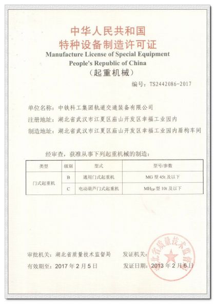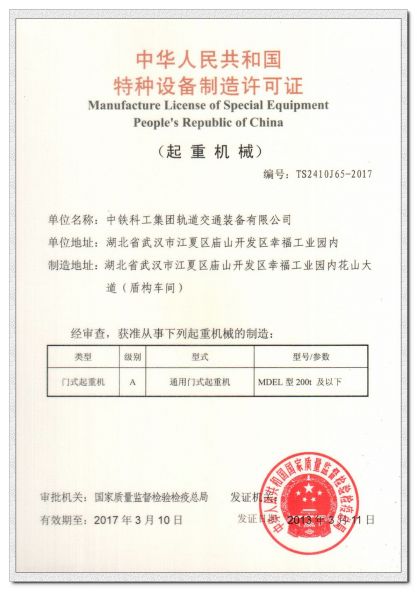 详细摘要: 中华人民共和国特种设备制造许可证门式起重机A级