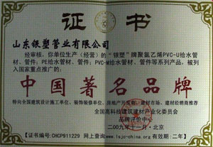 公司拥有目前国内最先进的PVC、PE管材管件生产线,专业的生产技术人员,年生产各种规格的PVC、PE管材管件两万多吨。公司生产的“银塑”牌管材、管件及系列节水产品多次被评为消费者满意产品,并通过国家、省、市三级检测。产品质量严格按照国家标准执行,顺利通过了ISO9001质量管理体系认证和ISO14001环境管理体系认证,积极推动了企业的规范性发展。