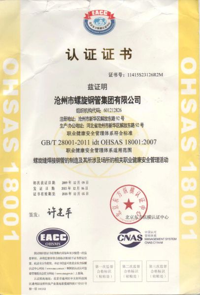 ISO职业健康安全管理体系证书