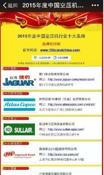 2015年度中国空压机行业十大品牌品牌